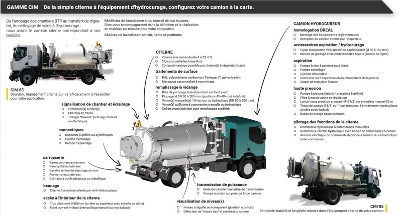 Information : Les citernes sur camion sont disponibles en version ADR pour le transport de matières dangereuses (hydrocurage sur sites industriels, transport d’hydrocarbures, etc).